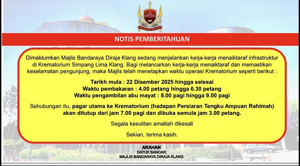 ANNOUNCEMENT: INFRASTRUCTURE UPGRADE WORKS AT SIMPANG LIMA KLANG CREMATORIUM