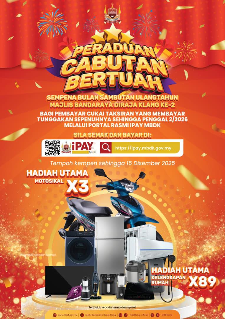 Jom Bayar & Menang! Sempena Bulan Sambutan Ulang Tahun ke-2 Majlis Bandaraya Diraja Klang (MBDK), anda berpeluang memenangi hadiah-hadiah menarik dengan hanya melunaskan cukai taksiran sepenuhnya sehingga setahun 2026! Jangan lepaskan peluang ini — Bayar Sekarang, Menang Kemudian! |