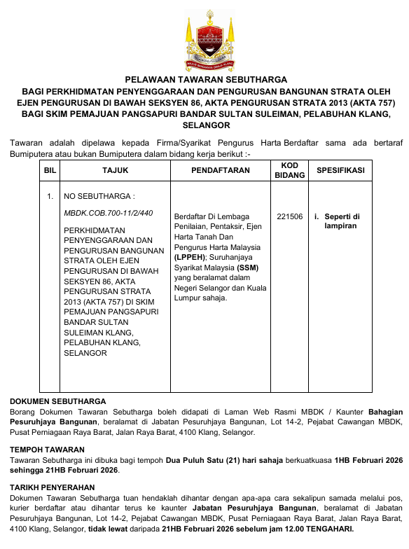 PELAWAAN TAWARAN SEBUTHARGA BAGI PERKHIDMATAN PENYENGGARAAN DAN PENGURUSAN BANGUNAN STRATA OLEH EJEN PENGURUSAN DI BAWAH SEKSYEN 86, AKTA PENGURUSAN STRATA 2013 (AKTA 757) BAGI SKIM PEMAJUAN PANGSAPURI BANDAR SULTAN SULEIMAN, PELABUHAN KLANG, SELANGOR